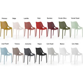 Silla de diseño, apilable,  polipropileno inyectado de color tórtora, reforzada con fibra de vidrio. Tratamiento anti  rayos UV. Uso en exterior e interior. Otros colores disponibles.