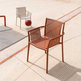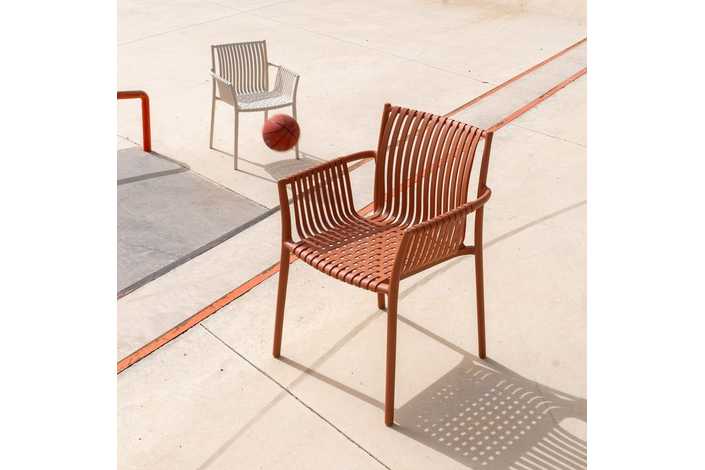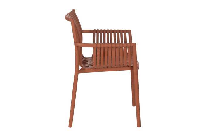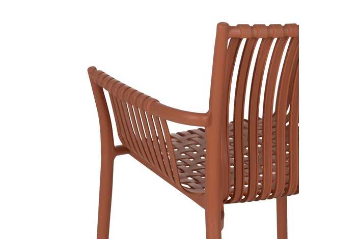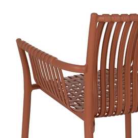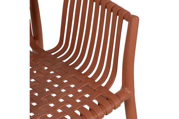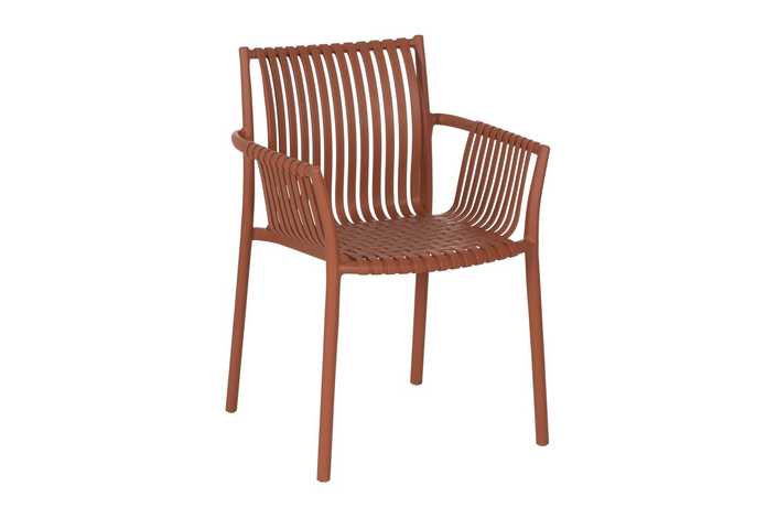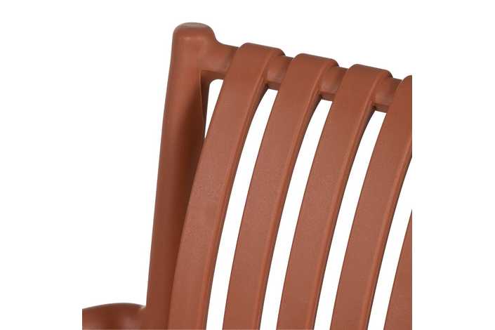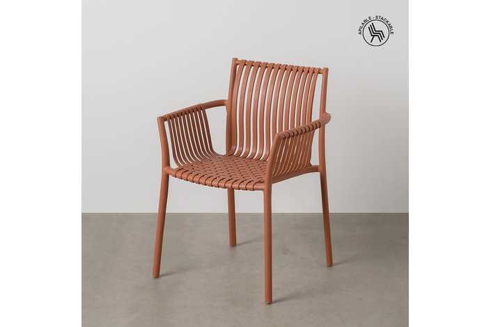 Material: polipropileno. Altura asiento: 45cm. Altura respaldo: 41cm. Ancho asiento: 41cm. Profundidad asiento: 44cm. Altura reposabrazos: 21cm. Cumple la normativa EN581 (uso exterior). Apilable.