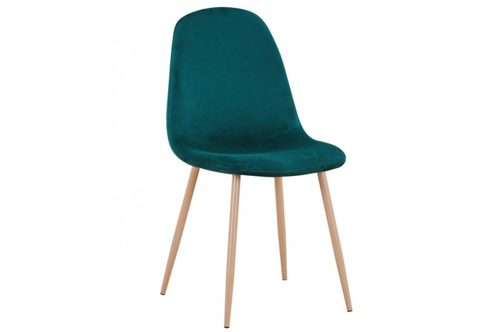 Silla de diseño, patas metálicas con acabado imitación madera, asiento y respaldo tapizados en terciopelo verde 56. Otros colores disponibles. Taburete a juego