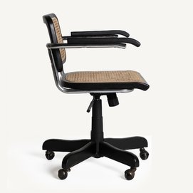 Silla escritorio salavas, en color negro/natural, de estilo contemporáneo. Fabricado en madera de olmo, combinado con acero y plástico. Producto desmontable, elevable.