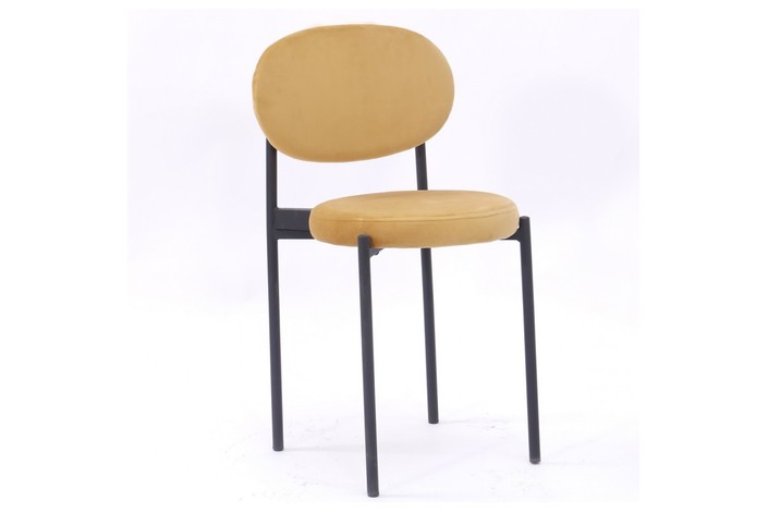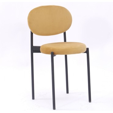 Silla de diseño, armazón metálico con acabado epoxi negro, asiento y respaldo tapizados en terciopelo amarillo. Otros colores disponibles. Taburete a juego