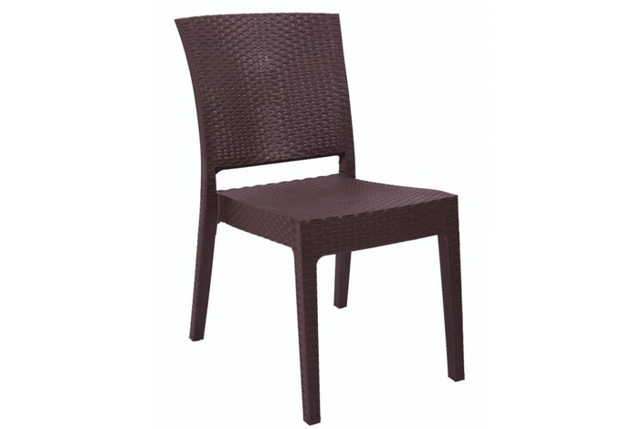 Silla apilable, imitación a ratán, polipropileno marrón chocolate. Uso en exterior e interior. Otros colores disponibles. Mesas a juego