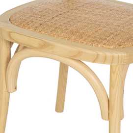 Estructura madera de olmo. Altura del asiento:46cm. Altura de las patas:43,5cm. Distancia entre las patas:39cm. Peso máximo soportado:150kgs. Cumple con la normativa UNE-EN16139-2013. Respaldo y asiento de ratán. Es apilable.
