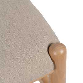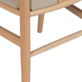 Estructura madera de haya. Altura del asiento:48cm. Altura de las patas:41,5cm Altura del respaldo:35,5cm. Distancia entre las patas:43,5cm Altura travesaño:30,5cm Medidas del asiento:50x40x5cm Composición cojines: Lino, acrílico, viscosa y poliéster. Densidad:30kg/m3 Relleno: Esponja. No apilable. No requiere montaje. Cumple con la normativa UNE-EN 12520:2015