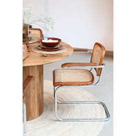 Dimensiones (cm) Longitud 65,5  |  Fondo 62  |  Altura 79 Peso neto producto (kg) 6,50 Material Olmo  |  Ratan  |  Metal