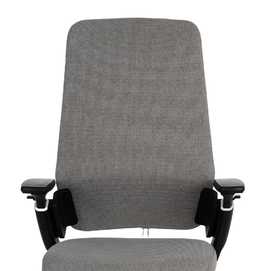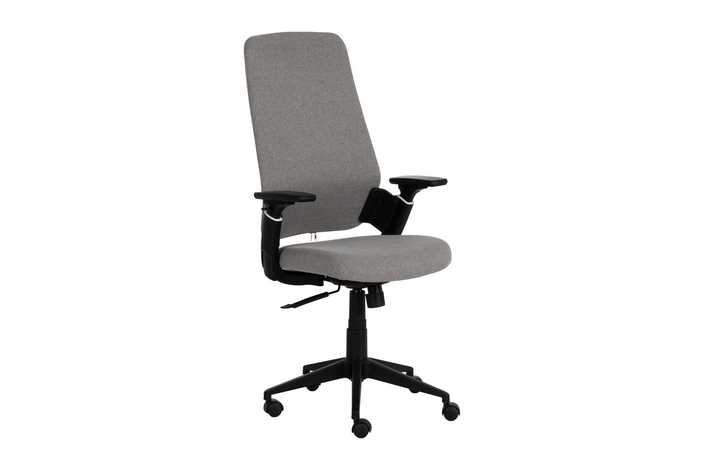 Material: pvc - hierro Tejido: 100% poliéster Altura máxima alcanzada: 124cm. Medida asiento: 49.5x50.5cm. Medida respaldo: 50x69.5cm. Altura, reposabrazos y respaldo regulables. UNE-EN 1335-1:2021 + A1:2023