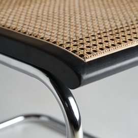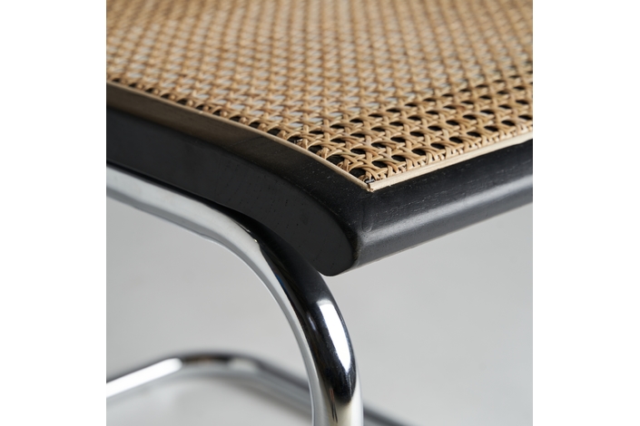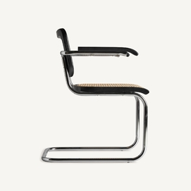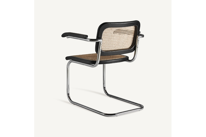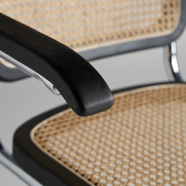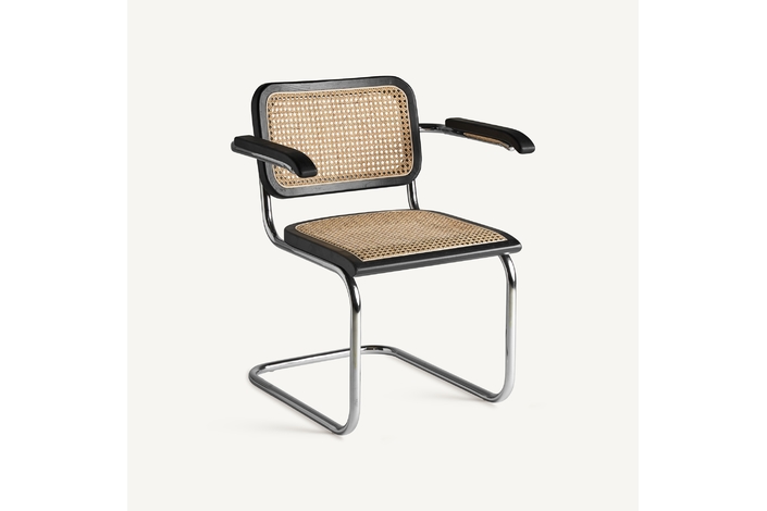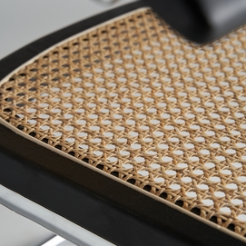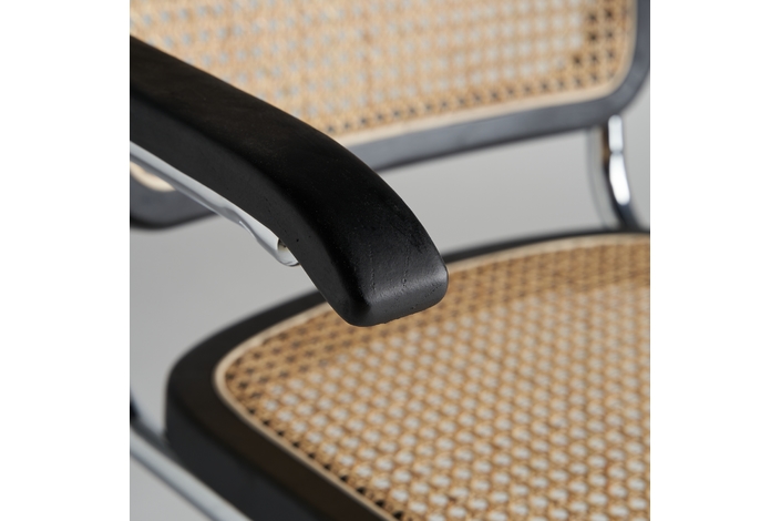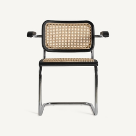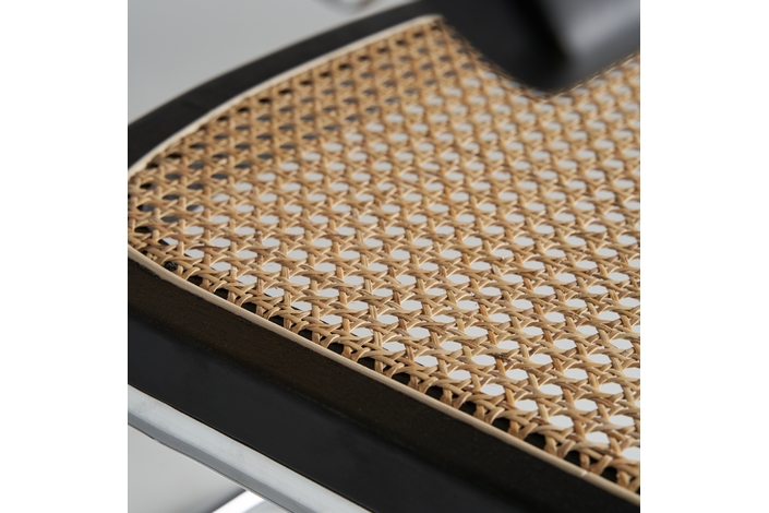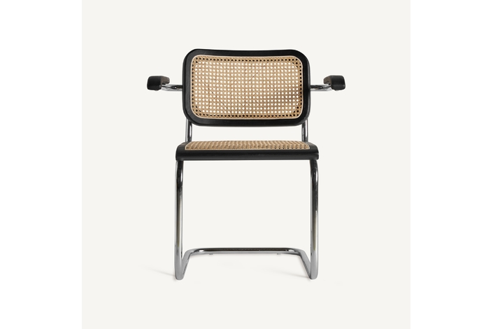 Sillón sins, en color negro/natural, de estilo contemporáneo. Fabricado en madera de olmo, combinado con ratán y acero.