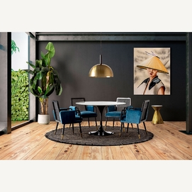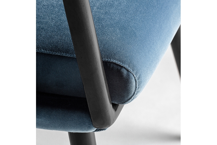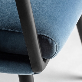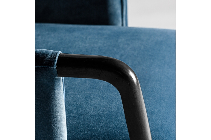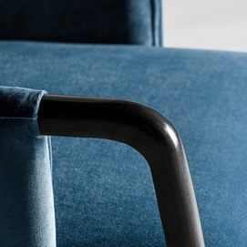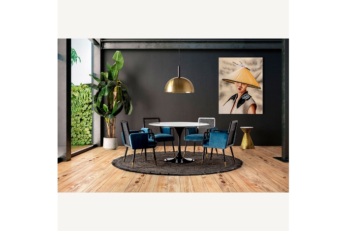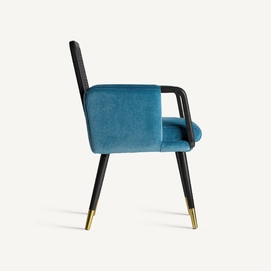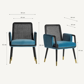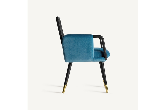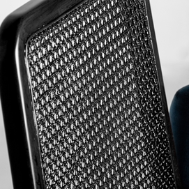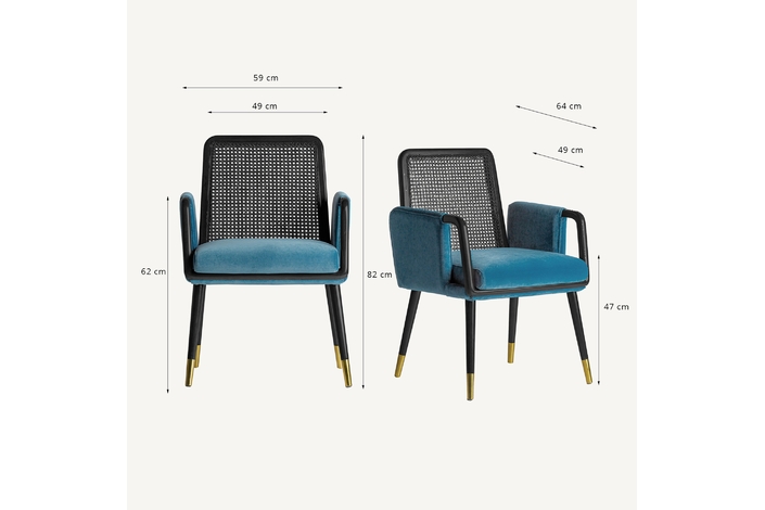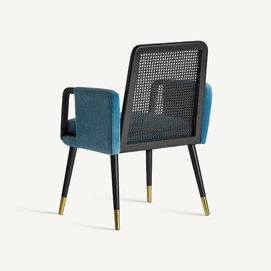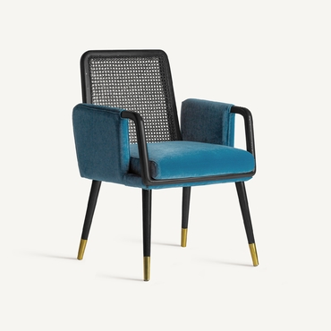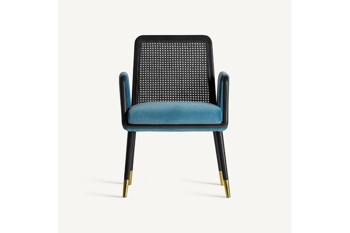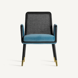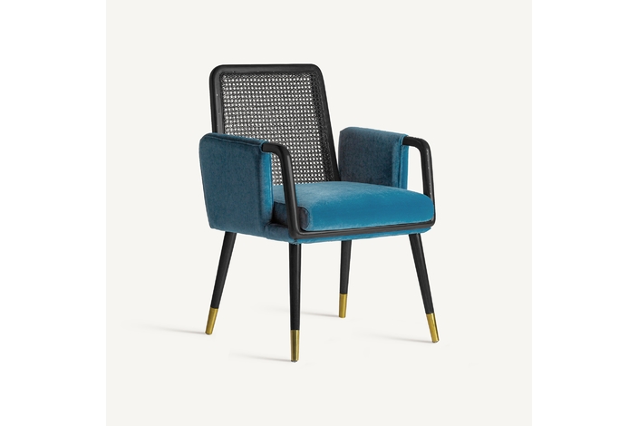 La silla Sladki combina artesanía y modernidad. Un clásico vintage tapizado en terciopelo azul y acabado en madera de nogal con tonos dorados y ratán. Un elemento imprescindible para aunar tradición y lujo.
