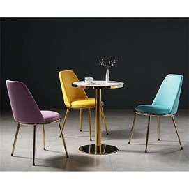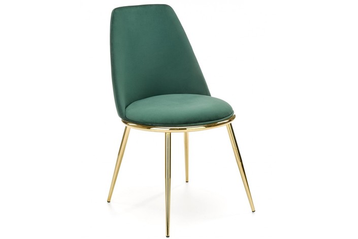 Silla de diseño, armazón metálico con acabado cromado dorado, asiento y respaldo tapizados en tejido velvet de color verde oscuro. Otros colores disponibles.