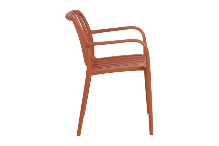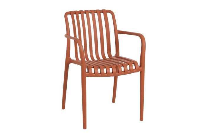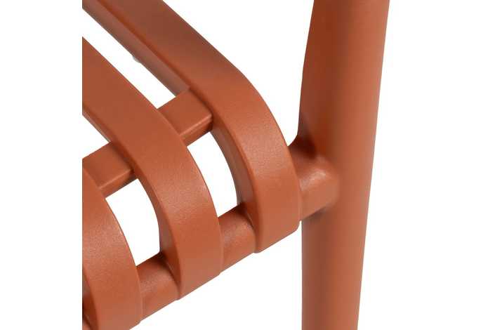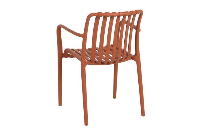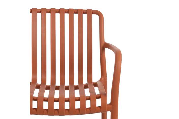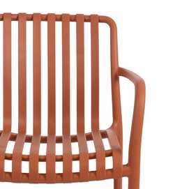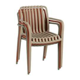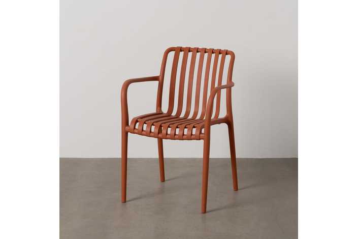 Material: polipropileno. Altura asiento: 46cm. Ancho asiento: 45cm. Profundidad asiento: 41cm. Altura respaldo: 40cm. Altura reposabrazos: 20cm (67cm desde el suelo). Apilable. Cumple la normativa EN581 (uso exterior).