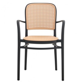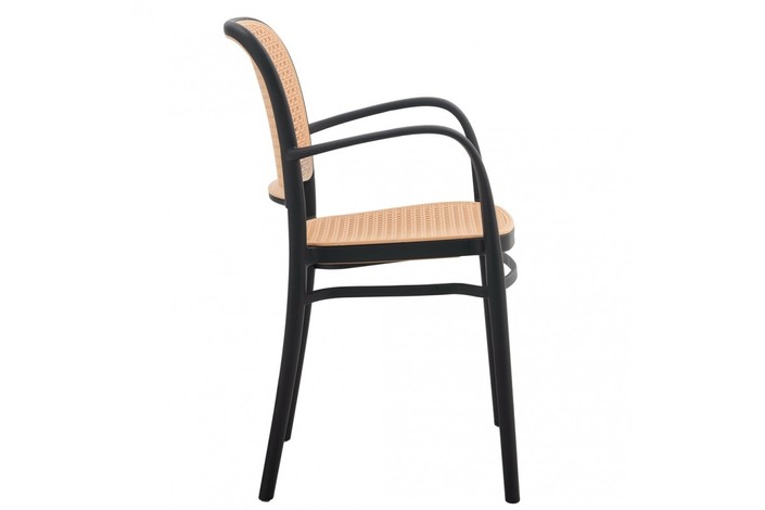 Sillón apilable, polipropileno negro y beige. Uso en exterior e interior. Otros colores disponibles. Mesas a juego.