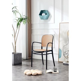 -Fabricado 100 % con Polipropileno, armazón de color negro con asiento y respaldo en rejilla beige.