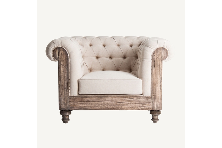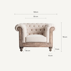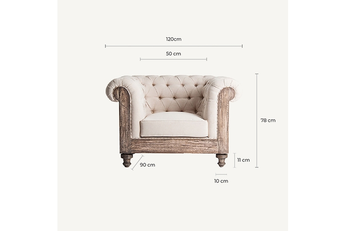 El Sillón Gore de VICAL home, estilo Chesterfield y medidas 113x90x80cm, combina la clásica elegancia con la funcionalidad. Fabricado en resistente madera tropical y tapizado en un delicado color beige, este sillón chesterfield de tela aporta un toque de sofisticación y confort que realza cualquier espacio de su hogar.