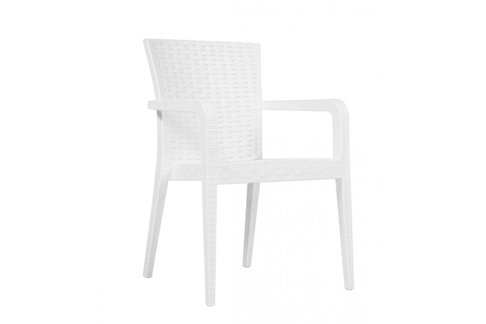 Sillón apilable, imitación a rattán, polipropileno blanco. Uso en exterior e interior. Otros colores disponibles. Mesas a juego.