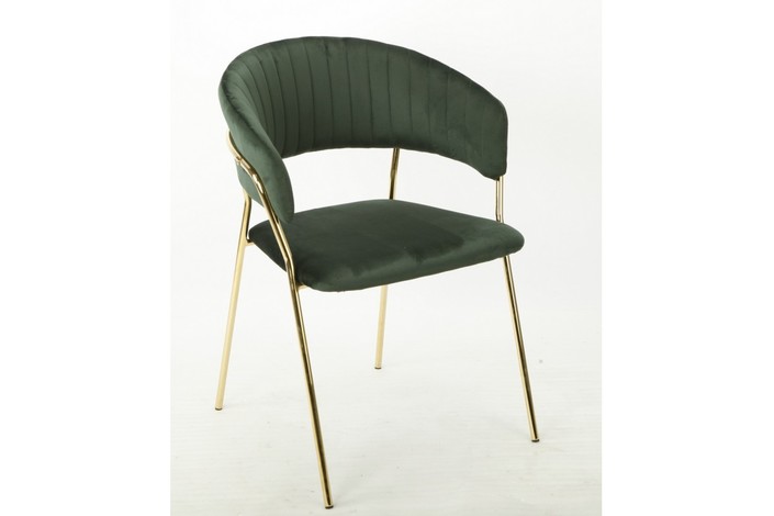 Sillón de diseño, armazón metálico con acabado cromado dorado, asiento y respaldo tapizados en tejido velvet de color verde oscuro. Otros colores disponibles. Taburete a juego