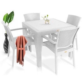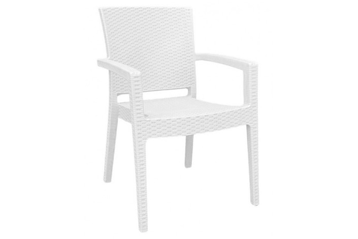 Sillón apilable, imitación a rattán, polipropileno blanco. Uso en exterior e interior. Otros colores disponibles. Mesas a juego