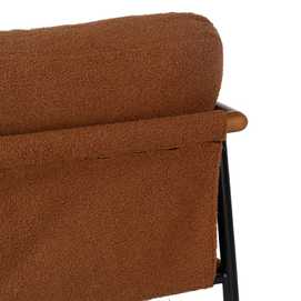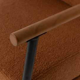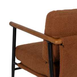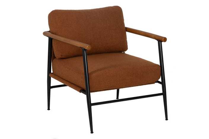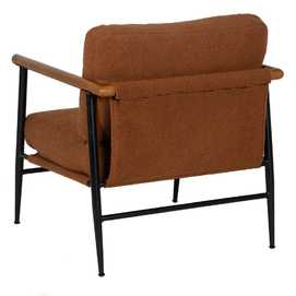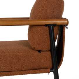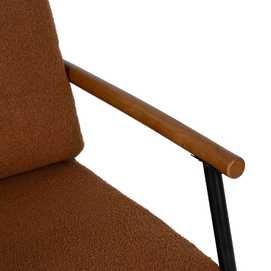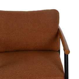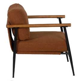 Material: madera de caucho, tejido color marrón. Altura asiento: 49cm. Ancho asiento: 62cm. Profundidad asiento: 52cm. Altura respaldo: 38cm. Altura patas: 29cm. Altura reposabrazos: 20cm. Cumple con la normativa UNE EN 12520:2016.