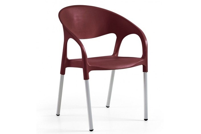 Sillón apilable, patas de aluminio anodizado, polipropileno burdeos. Uso en exterior e interior. Otros colores disponibles