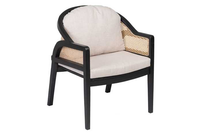 Material: Madera de teca, ratán. Altura asiento: 43cm. Profundidad asiento: 37cm. Altura patas: 32cm. Altura reposabrazos: 17cm. Altura respaldo: 37cm. Peso soportado: 120kg. Cojines desenfundables. Cumple la normativa EN16139 (catering).