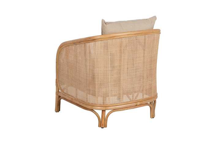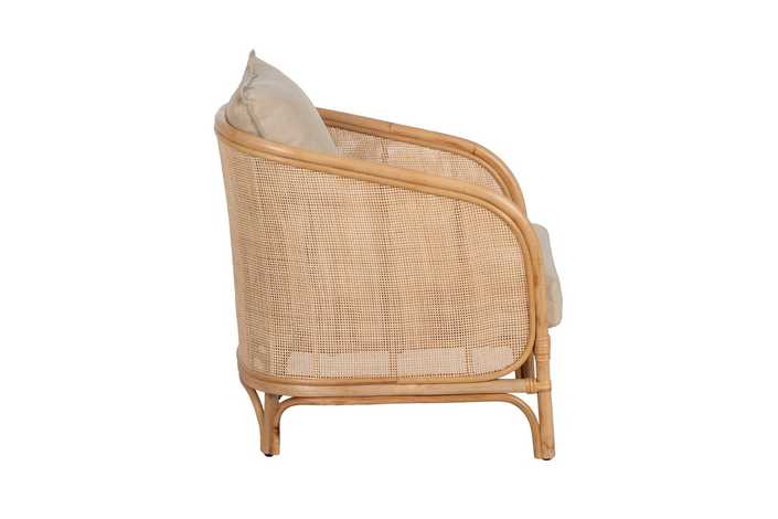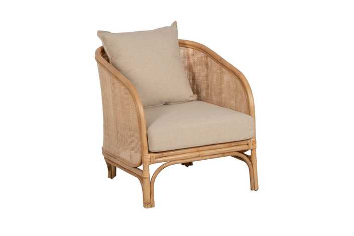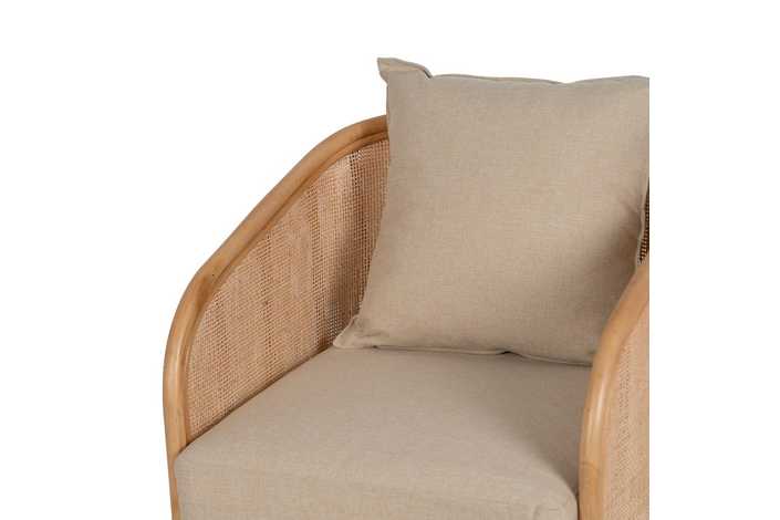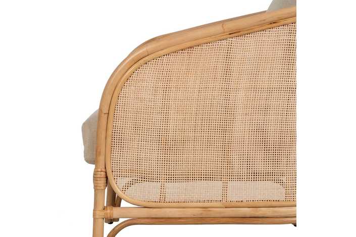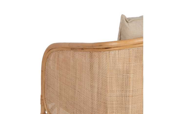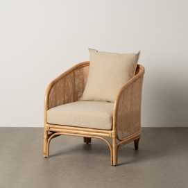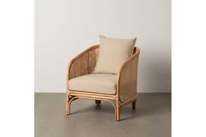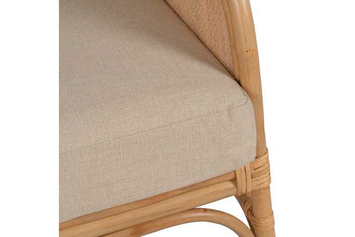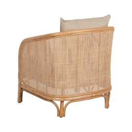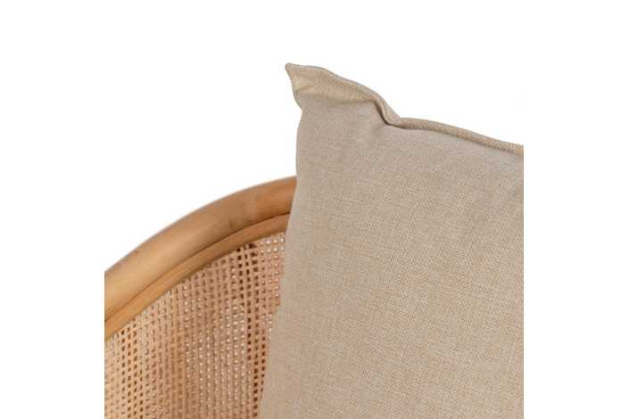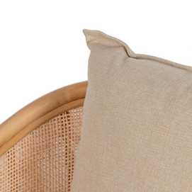 Material: ratán Asiento y respaldo: 100% poliéster Relleno: foam 25D. Grueso cojín asiento y respaldo: 12cm. Cojín desenfundable Uso interior. Altura asiento: 42cm. Altura respaldo: 36.5cm.