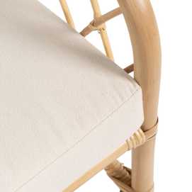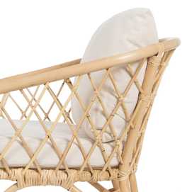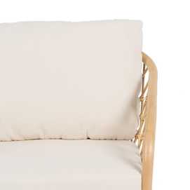 Material: ratán. Cojines desenfundables. Tejido: 60% algodón, 40% poliéster. Relleno: foam, densidad 23kg/m3. Altura asiento: 44cm. Ancho asiento: 60cm. Profundidad asiento: 57cm (38cm con cojin incluido). Peso máximo soportado: 150kg.
