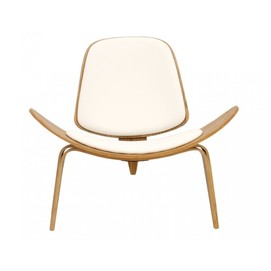 Sillón de diseño, chapa de madera de fresno, tapizado en similpiel de color blanco