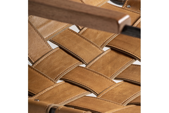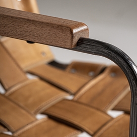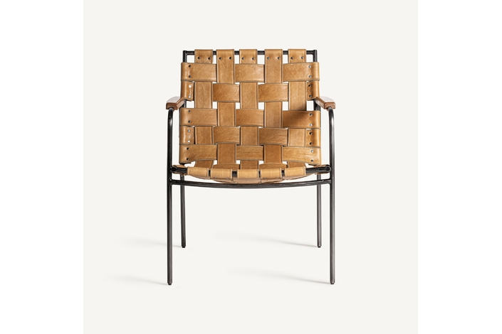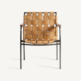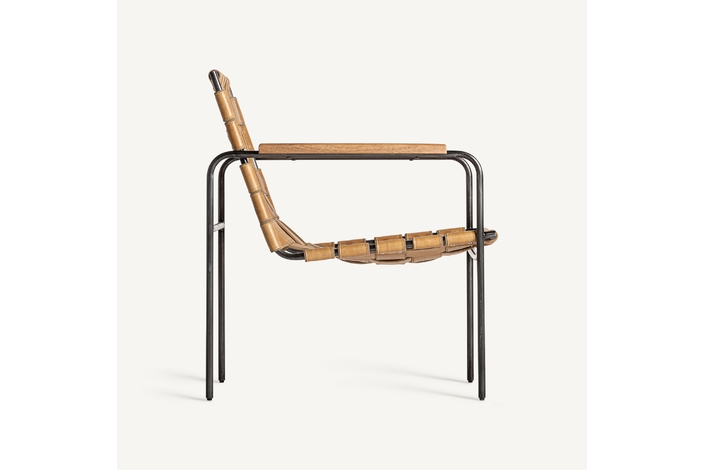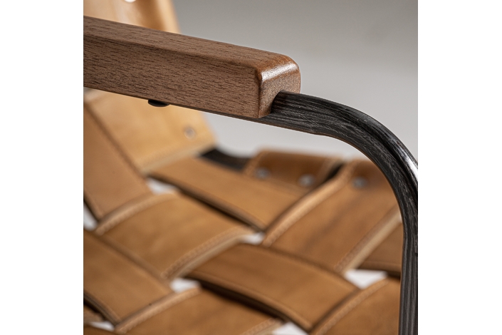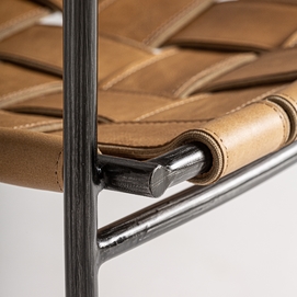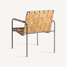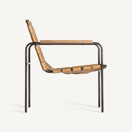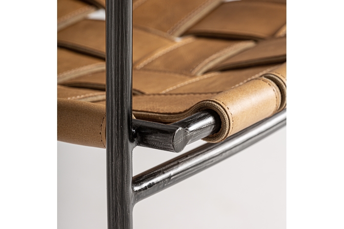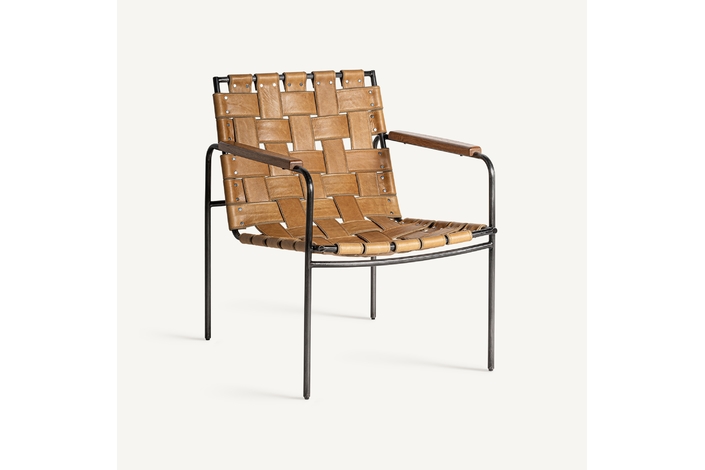 Sillón tarland, en color marrón, de estilo art deco. Fabricado en piel, combinado con hierro y madera de fresno.