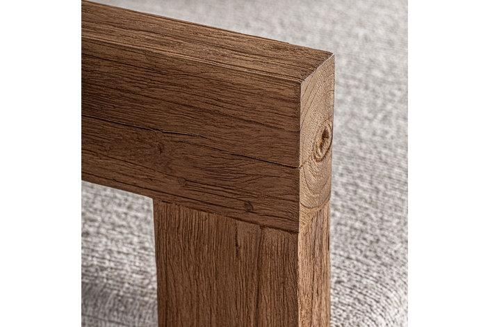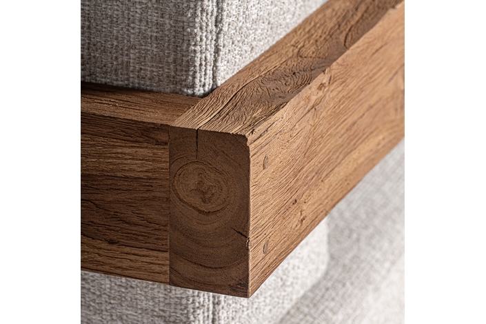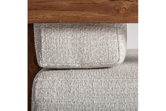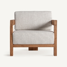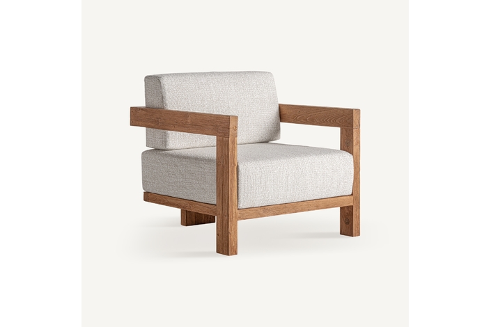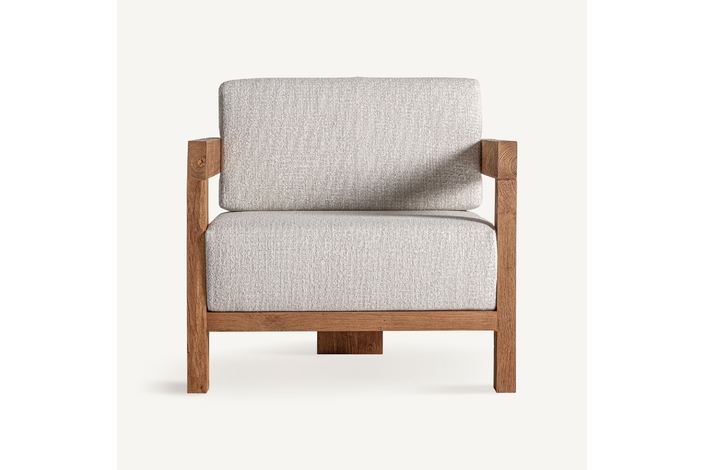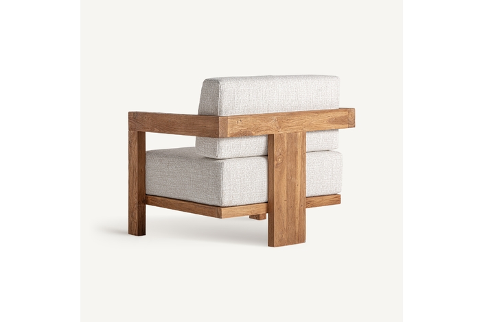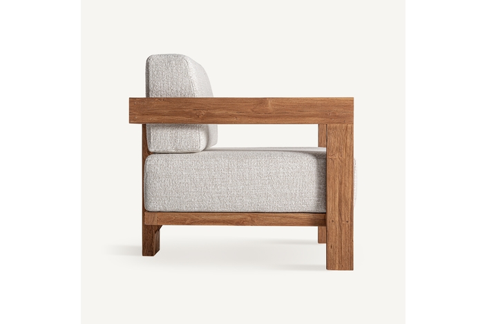 Sillón testa de estilo colonial, fabricado en madera de teka reciclada en color marrón, combinado con polipropileno reciclado en color beige y espuma. Producto desmontable, desenfundable.