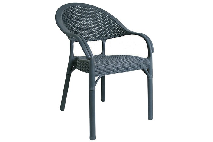 Sillón apilable, imitación a rattán, polipropileno gris azulado. Uso en exterior e interior. Otros colores disponibles.