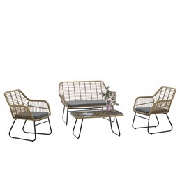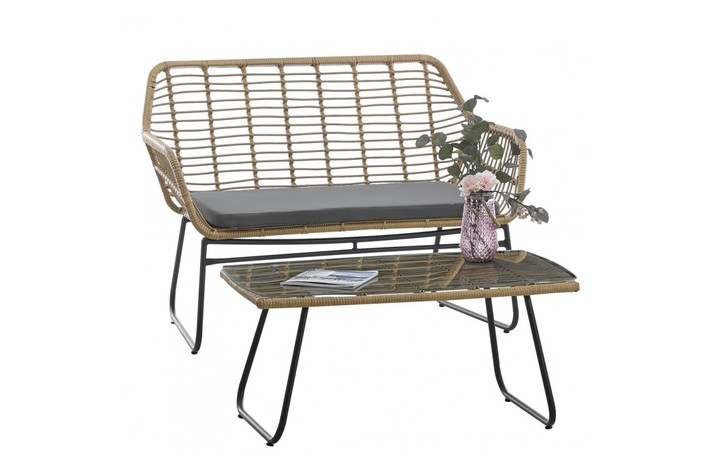 Sofá de diseño, base de metal con acabado pintura epoxi de color negro mate, asiento y respaldo de ratán sintético de color beige. Cojín en el asiento de color negro. Uso en interior y exteriores protegidos. Sillón y mesa baja rectangular a juego opcional.
