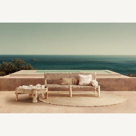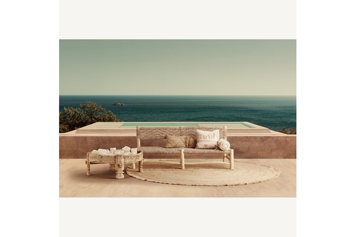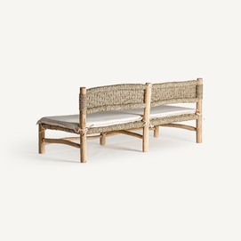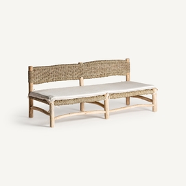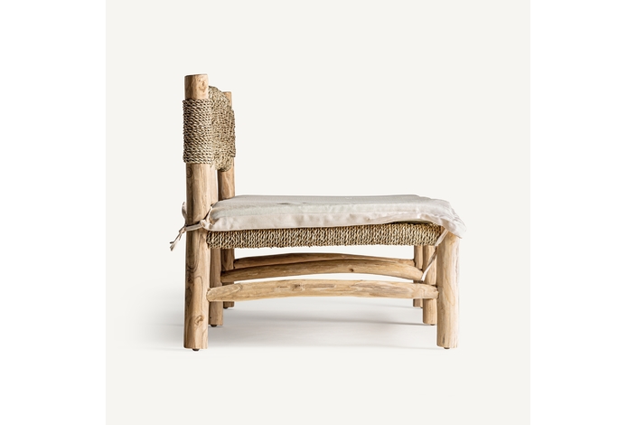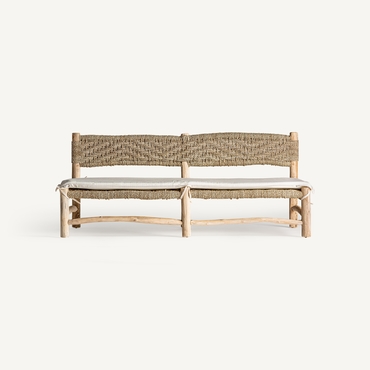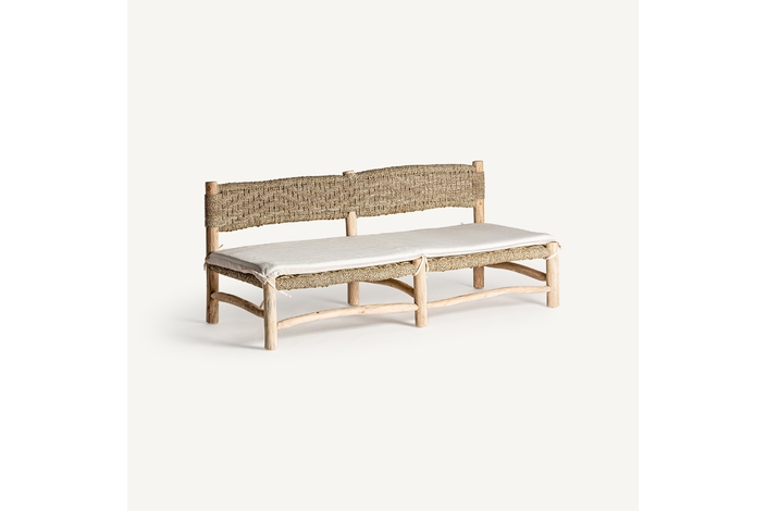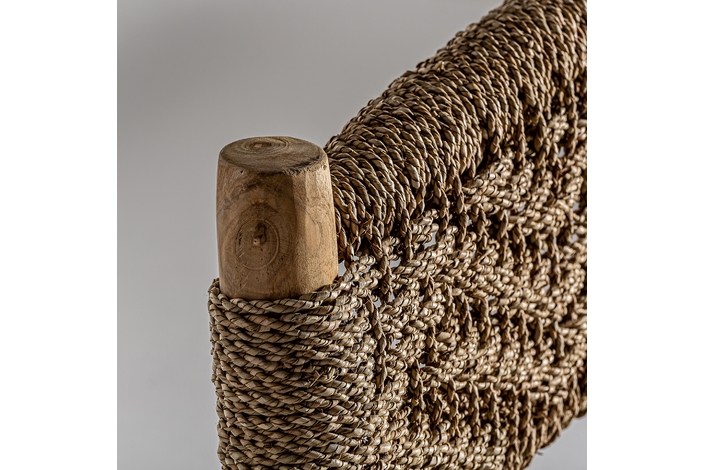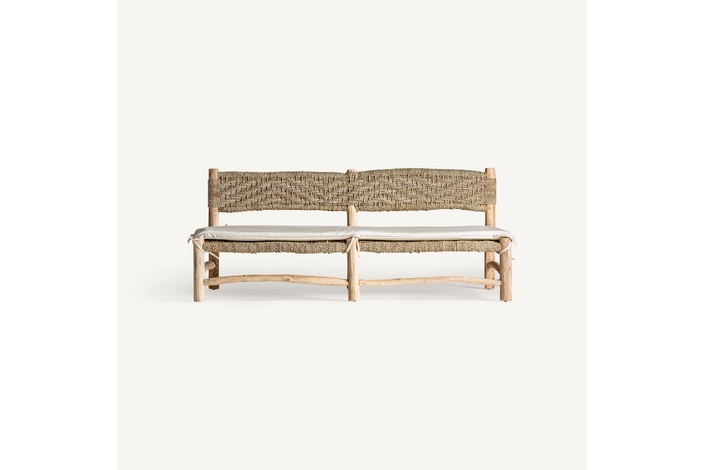 Sofá manhula, en color marrón, de estilo colonial. Fabricado en madera de teka, combinado con fibra natural y poliéster.