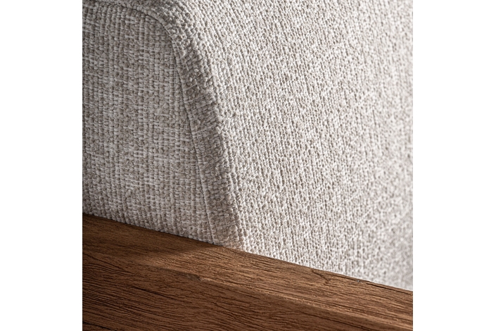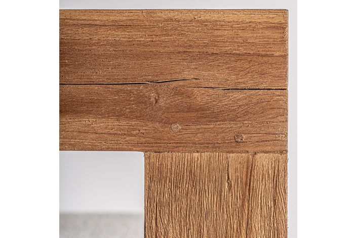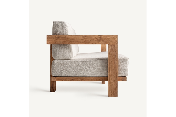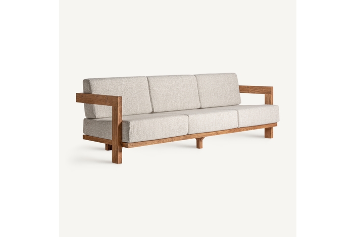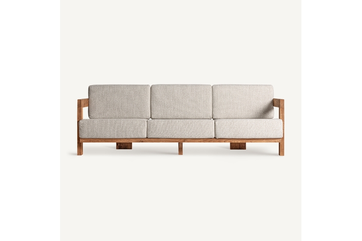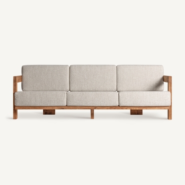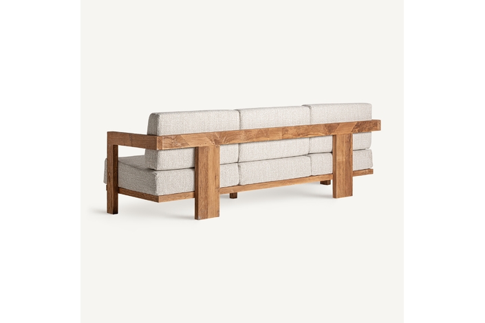 Sofá testa de estilo colonial, fabricado en madera de teka reciclada en color marrón, combinado con polipropileno reciclado y espuma. Producto desmontable, desenfundable.