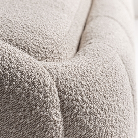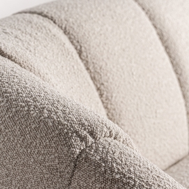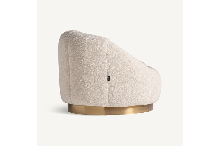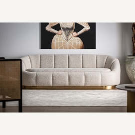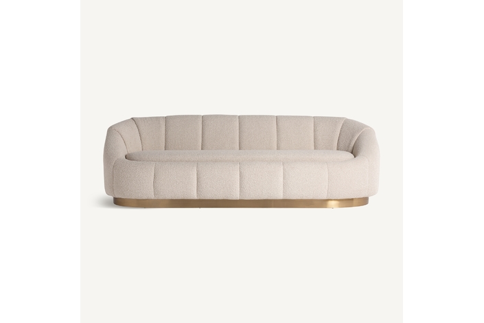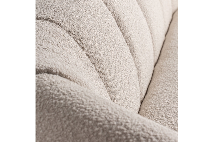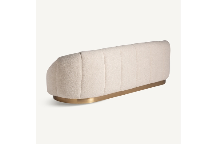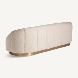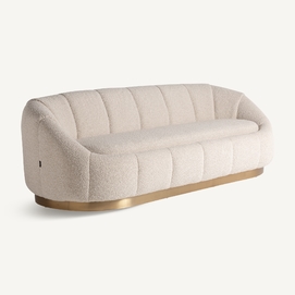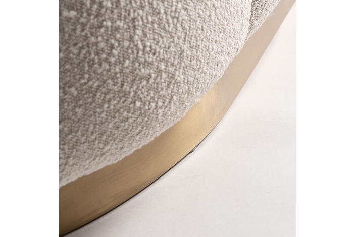 Sofá thyez bouclé, de estilo art deco. Fabricado en algodón bouclé, en color blanco, combinado con acero, en color oro y madera de pino.