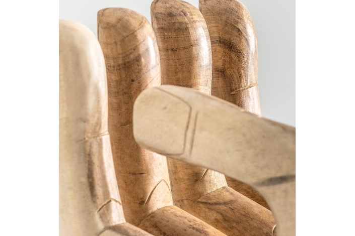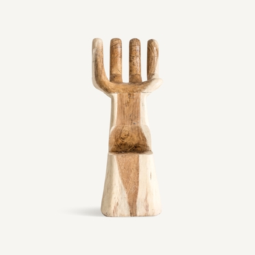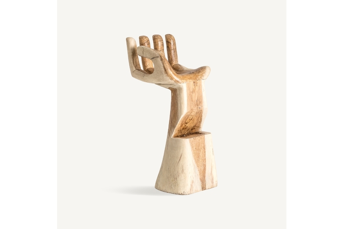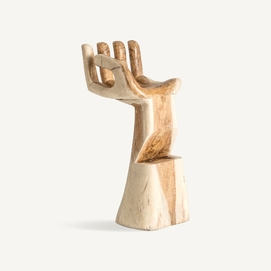 Taburete mano, en color natural envejecido, de estilo étnico. Fabricado en madera suar. Pueden salir en sentido derecha e izquierda.