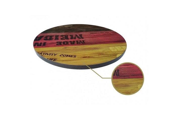 Tablero de mesa vintage, 25 mm de espesor. Formato redondo de 60 cms. de diámetro. Canto de PVC