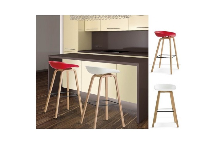 Taburete de diseño, madera, asiento de polipropileno de color rojo. Otros colores disponibles