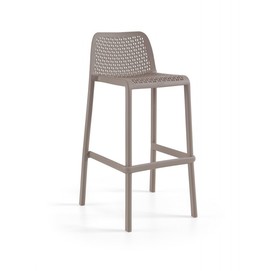 Taburete de diseño, con respaldo, polipropileno inyectado reforzado con fibra de vidrio, color blanco. Tratamiento anti rayos UV. Uso en exterior e interior. Silla y sillón a juego. Otros colores disponibles.