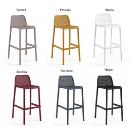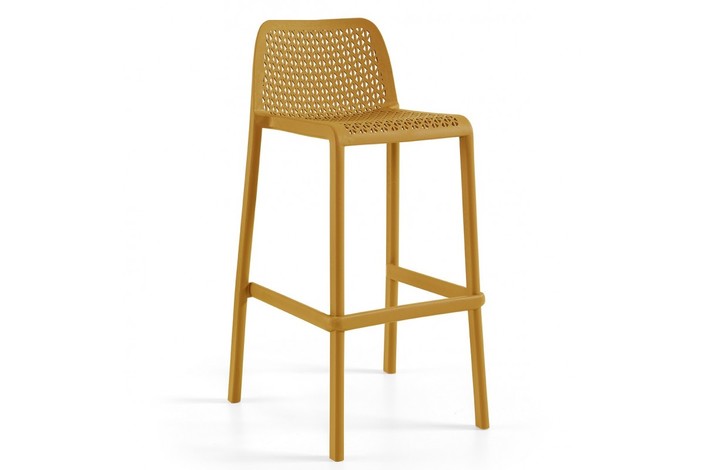 Taburete de diseño, con respaldo, polipropileno inyectado reforzado con fibra de vidrio, color mostaza. Tratamiento anti rayos UV. Uso en exterior e interior. Silla y sillón a juego. Otros colores disponibles.
