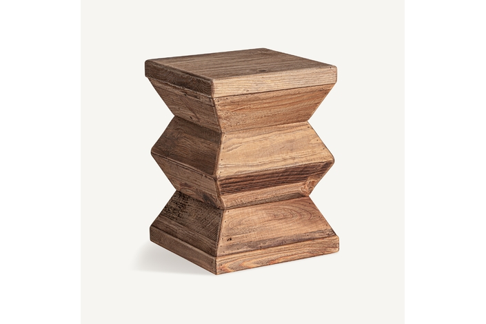 Taburete breive, de estilo rústico. Fabricado en madera de pino reciclado, en color marrón envejecido.