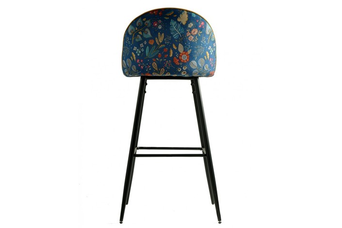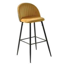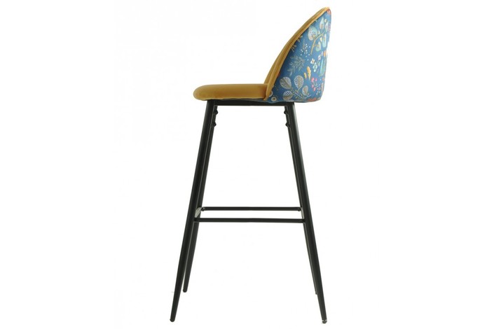 Taburete de diseño, armazón metálico con acabado epoxi negro, asiento y respaldo tapizados en terciopelo amarillo,  trasera en tejido decorado carnaval. Otros colores disponibles. Silla a juego