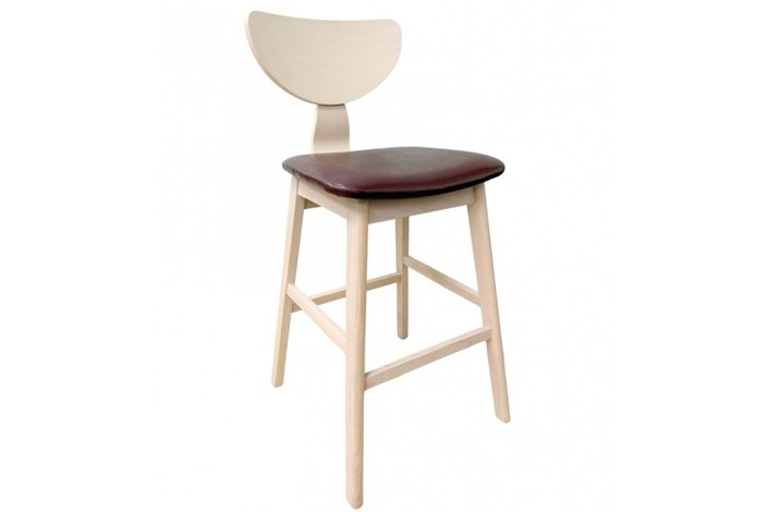 Taburete de diseño, multiusos, armazón de madera maciza de hevea, asiento y respaldo de contrachapado de madera de hevea, barnizado natural, tapizado similpiel marrón. Silla a juego