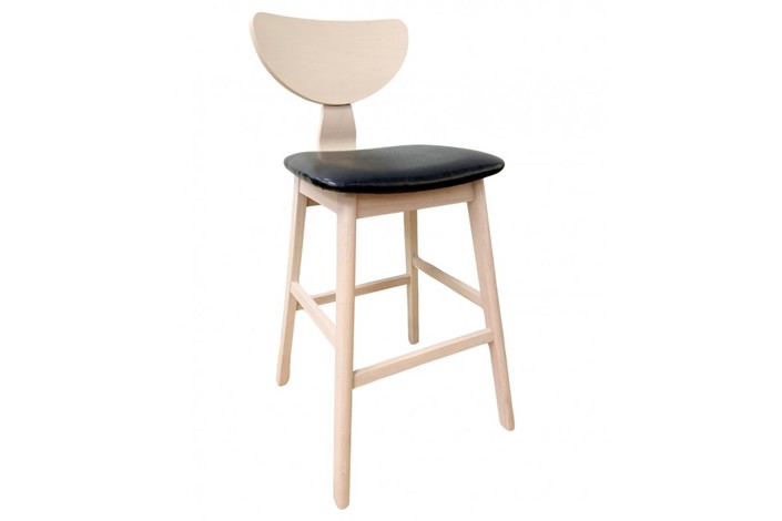 Taburete de diseño, multiusos, armazón de madera maciza de hevea, asiento y respaldo de contrachapado de madera de hevea, barnizado natural, tapizado similpiel negra. Silla a juego