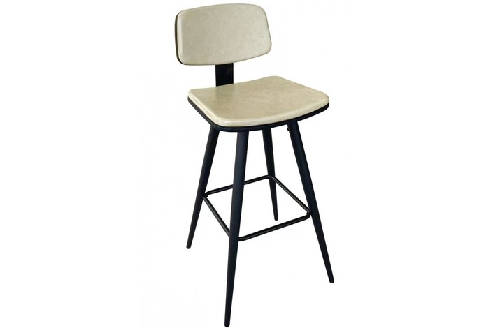 Taburete de diseño, armazón metálico pintado en negro, asiento tapizado en similpiel beige vintage. Uso en interiores.