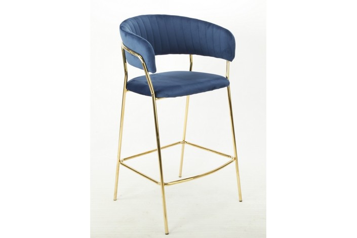 Taburete de diseño, armazón metálico con acabado cromado dorado, asiento tapizado en terciopelo de color azul. Uso en interiores. Otros colores disponibles. Sillón a juego