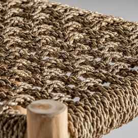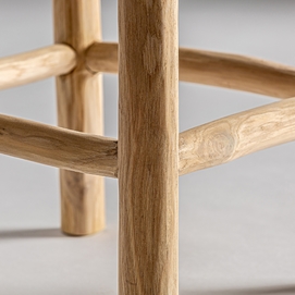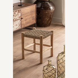 Taburete manhula, en color marrón, de estilo colonial. Fabricado en madera de teka, combinado con fibra natural.