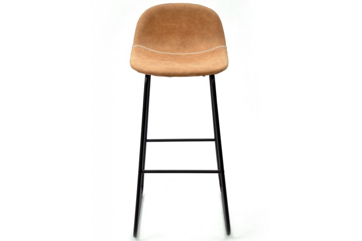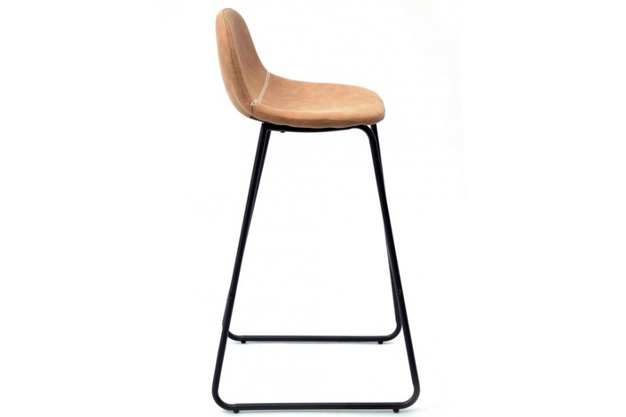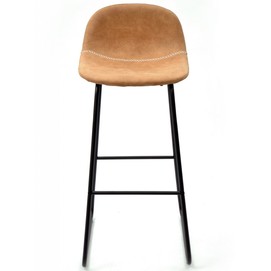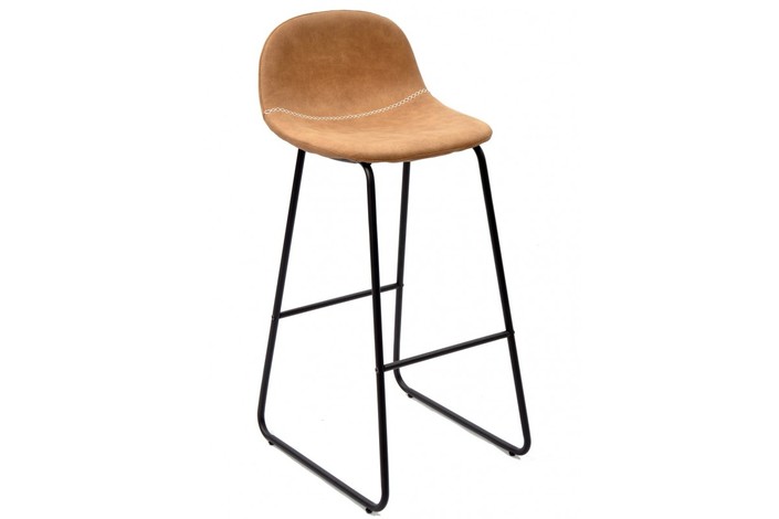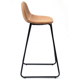 Taburete de diseño, armazón metálico pintado en negro, asiento tapizado en similpiel vintage marrón claro. Uso en interiores.