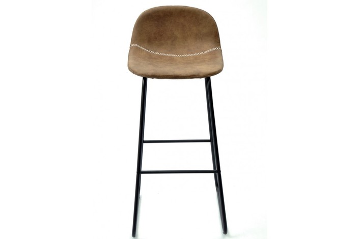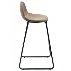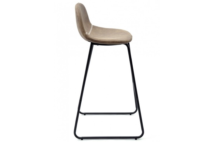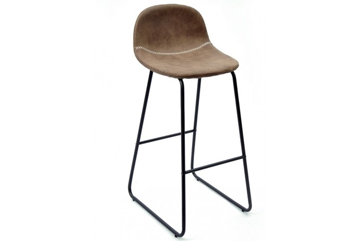 Taburete de diseño, armazón metálico pintado en negro, asiento tapizado en similpiel vintage marrón oscuro. Uso en interiores.
