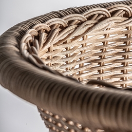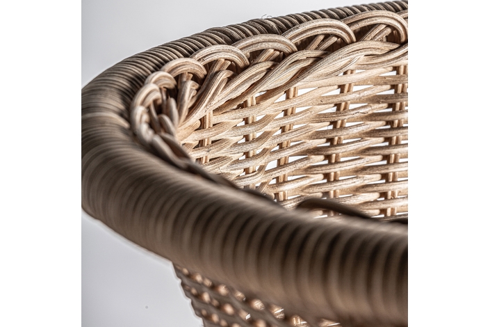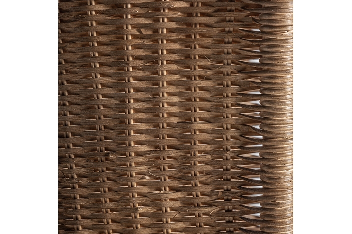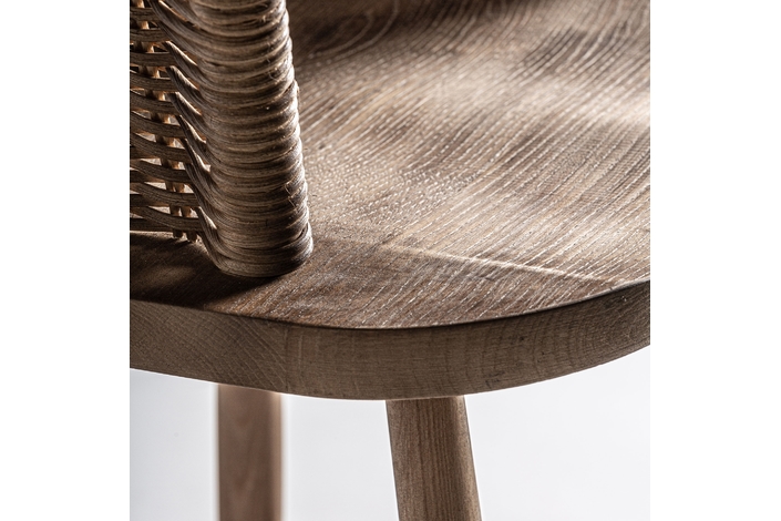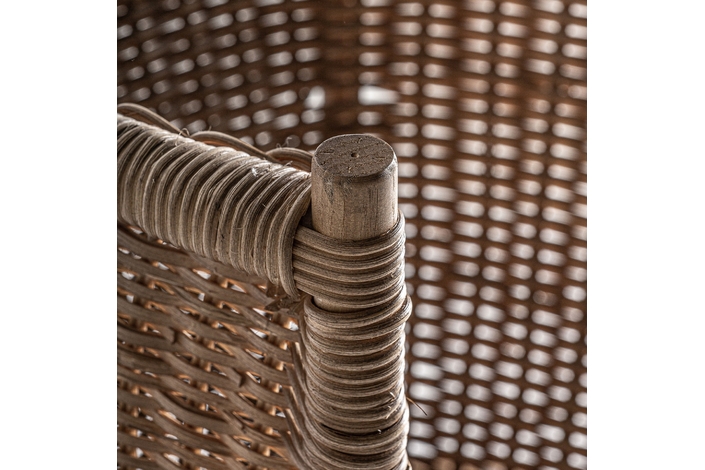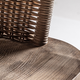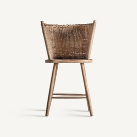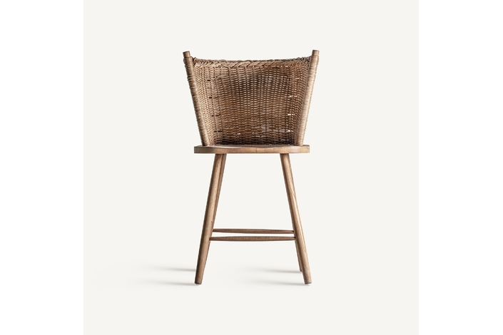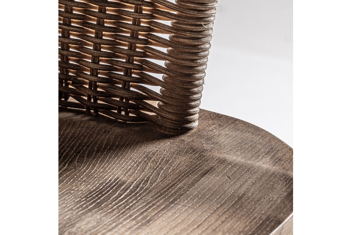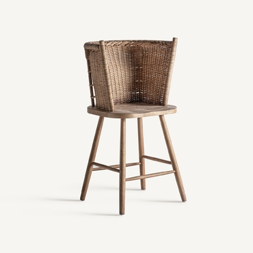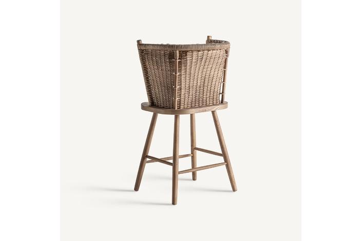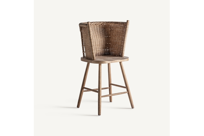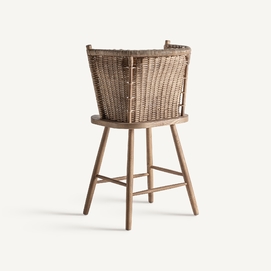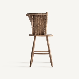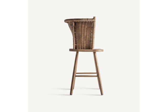 Taburete quenza, de estilo boho. Fabricado en madera de abeto, en color marrón, combinado con mimbre.