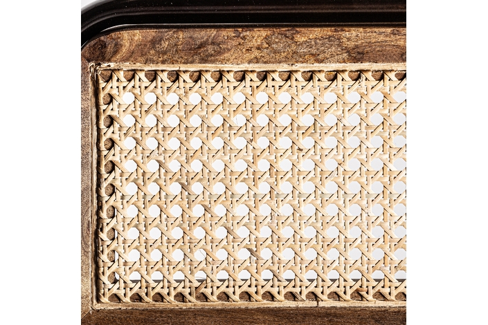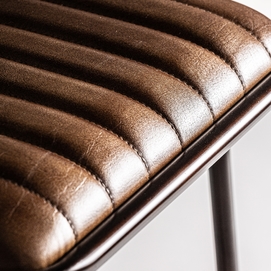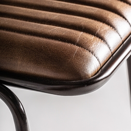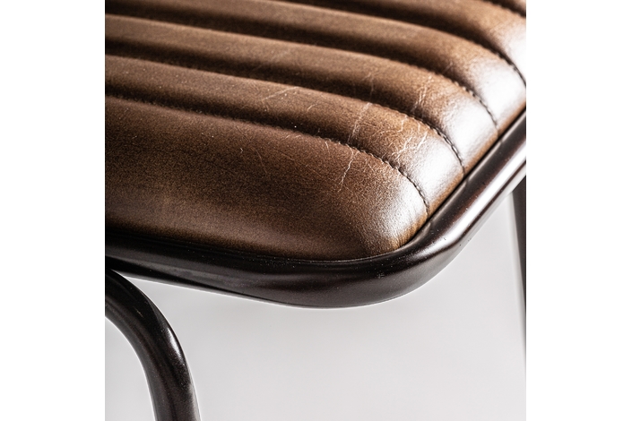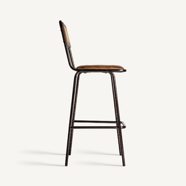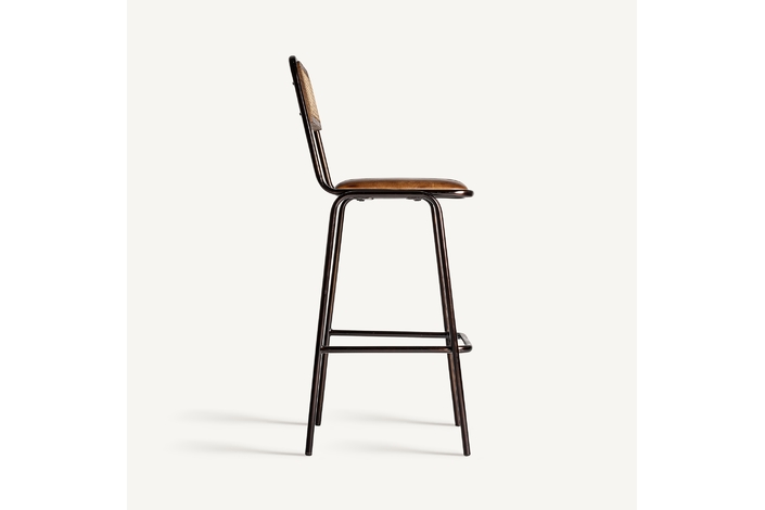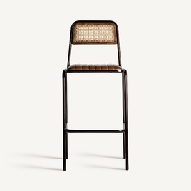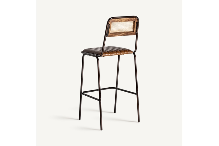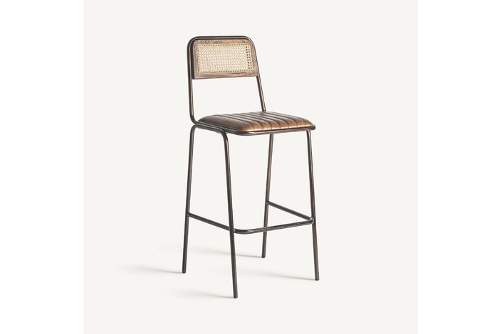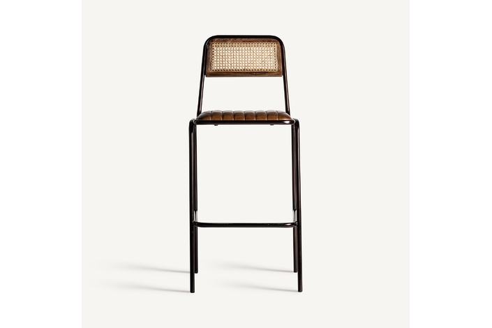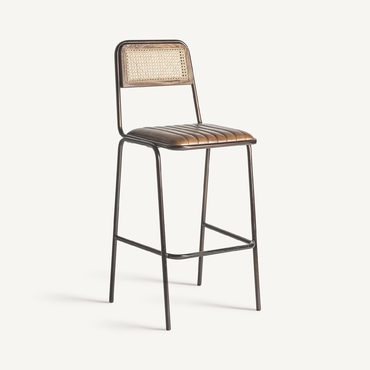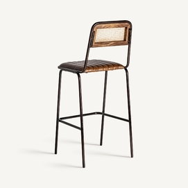 Taburete snasa, en color marrón, de estilo vintage. Fabricado en piel, combinado con hierro y mimbre. Producto desmontable.