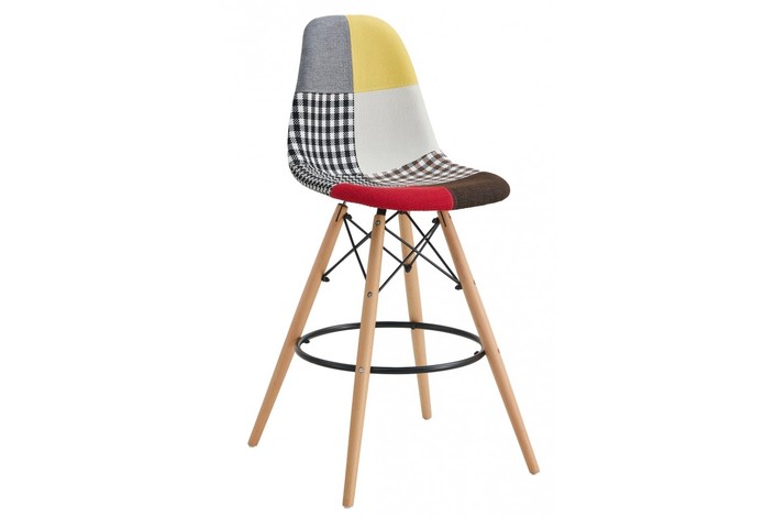 Taburete de diseño, madera, carcasa tapizada tejido patchwork. Sillas a juego.